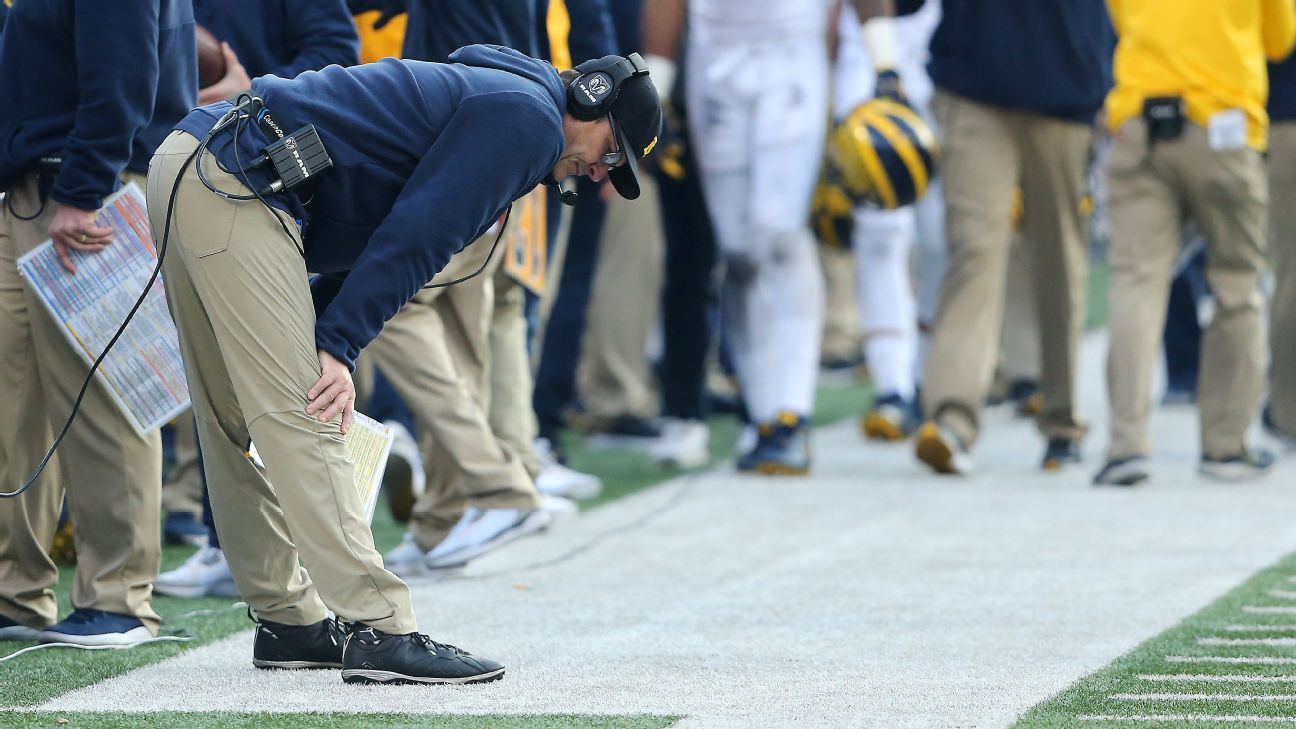 COLUMBUS, Ohio — Jim Harbaugh crouched with his hands on his knees as he watched Ohio State’s offense set up in the red zone at Ohio Stadium for the final play of the regular season, just as he did two years ago.