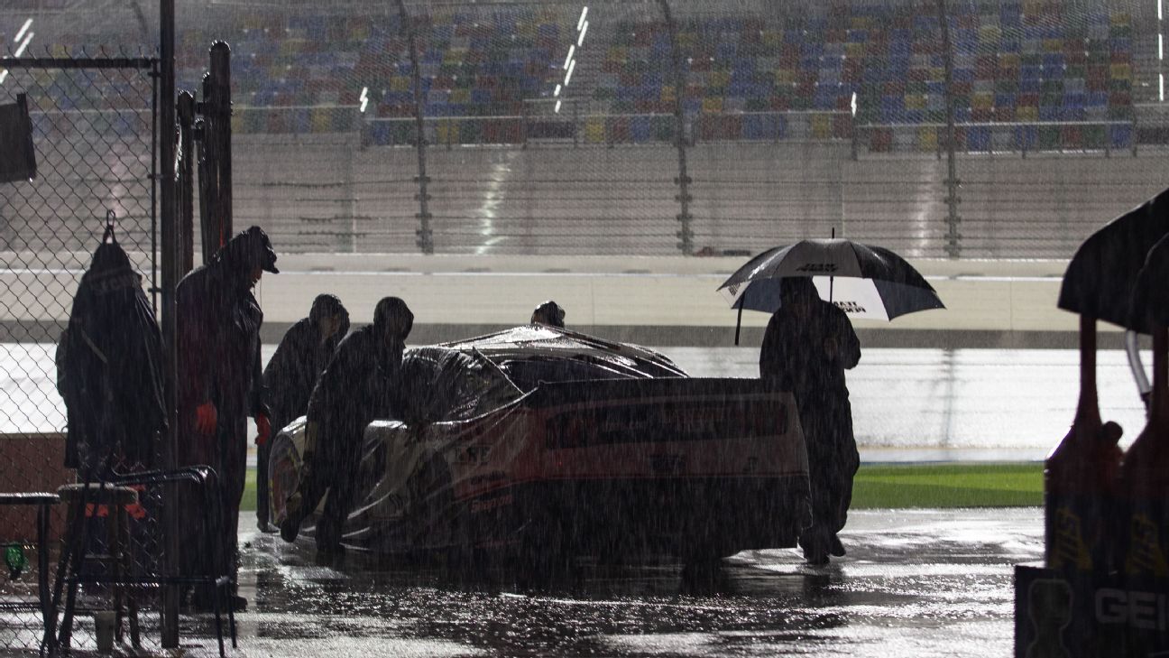 The first delay of the day came moments after the presidential motorcade completed a ceremonial parade lap around the 2 1/2-mile track. Trump’s armored limousine nicknamed “The Beast” exited Daytona International Speedway, and the sky opened for a brief shower that forced drivers back to pit road.
