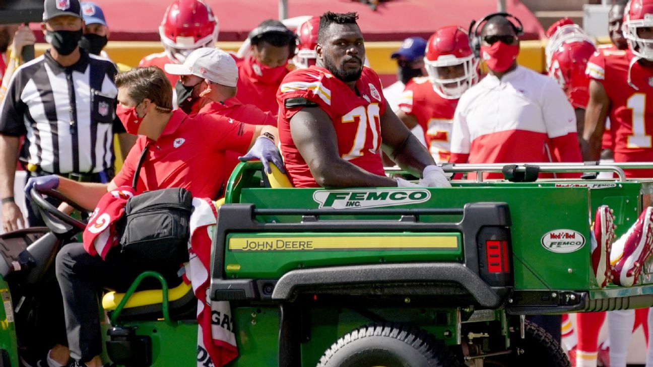 Osemele was injured without being hit. He stumbled on the turf after trying to block on a Patrick Mahomes scramble. He was taken off the field on a cart.