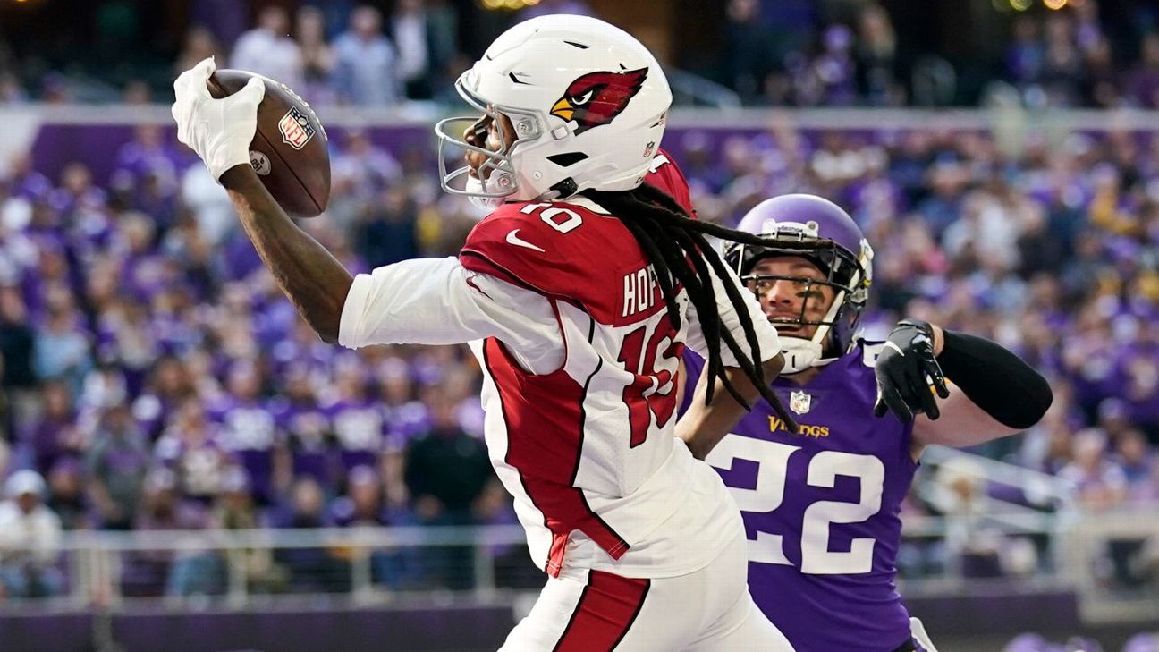 Hopkins was the wide receiver to the left of quarterback Kyler Murray, but he was bunched in the slot. He broke toward the end zone and Vikings safety Harrison Smith picked up Hopkins near the goal line. Murray put the ball over Smith’s head and Hopkins extended with his left hand to catch it.